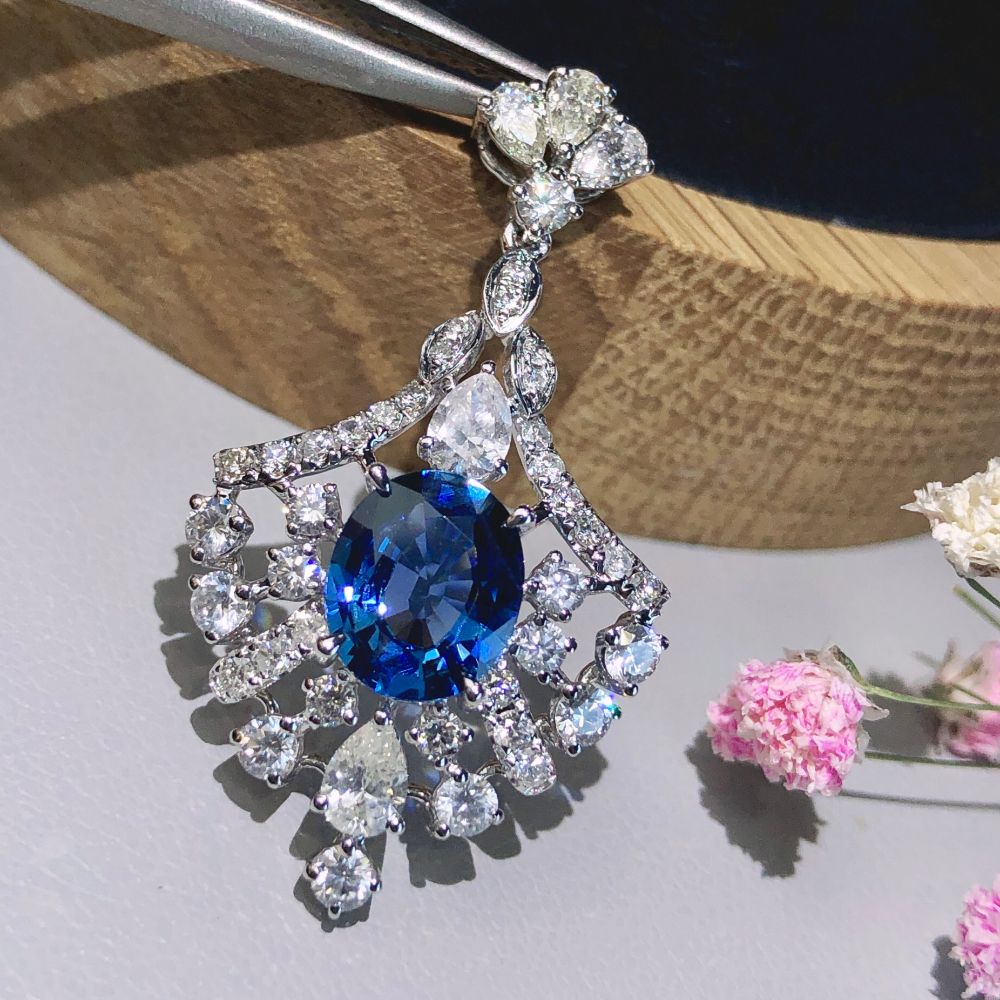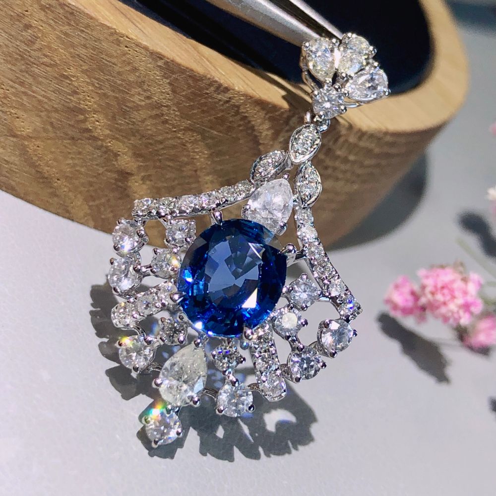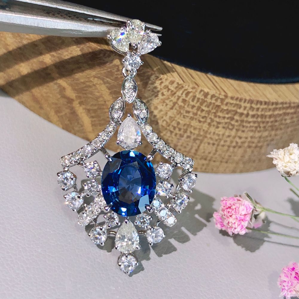 | 产品简介: | 2.11ct无烧皇家蓝蓝宝石吊坠,18K金镶1.633ct钻石,玻璃体满火彩,镂空精致款 | ||